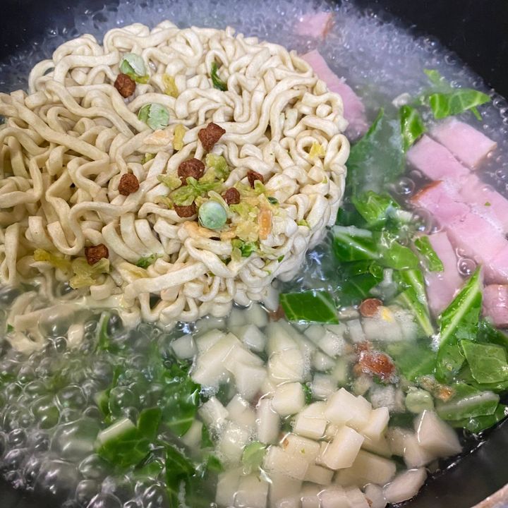 沸騰したら麺とかやくを入れ一緒に ジャガイモとキャベツと角切りベーコンを入れます。