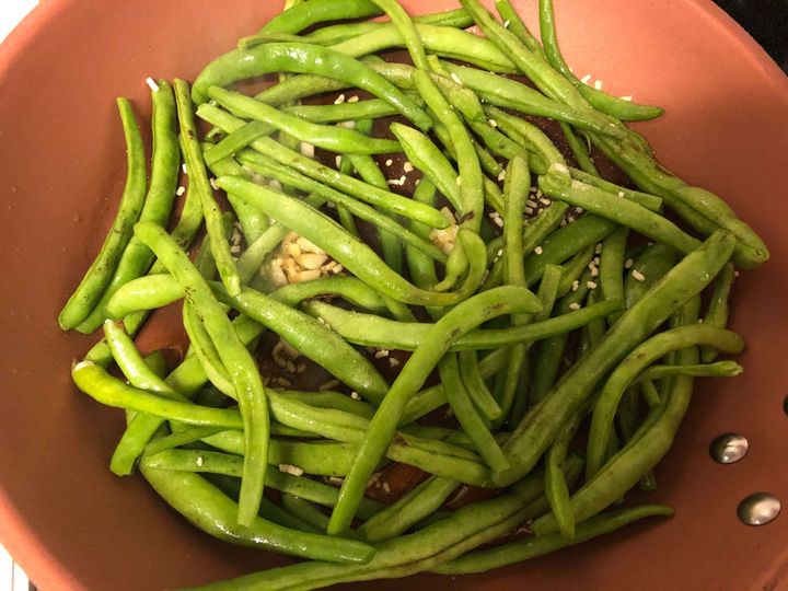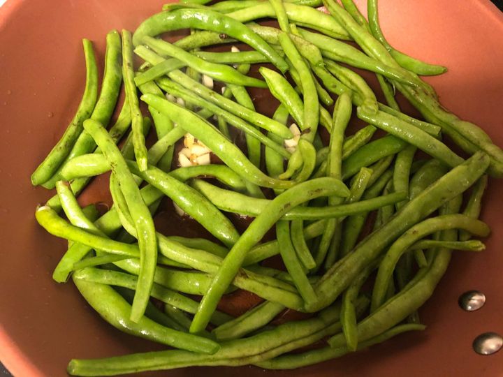 にんにくの香りが立ってきたら、いんげんを加えて炒める。