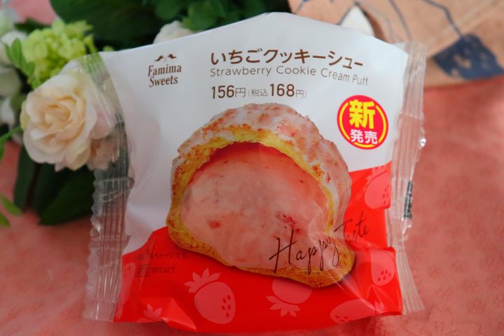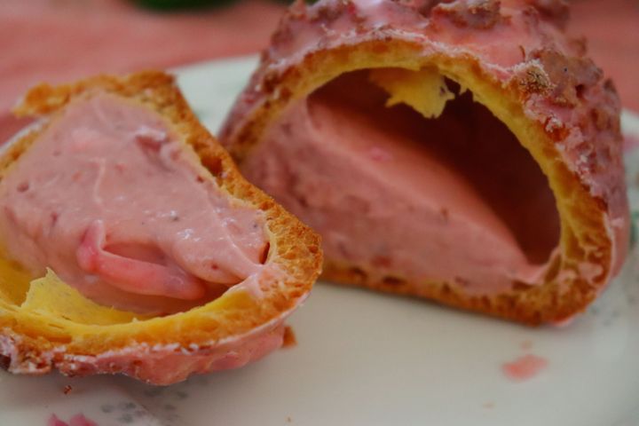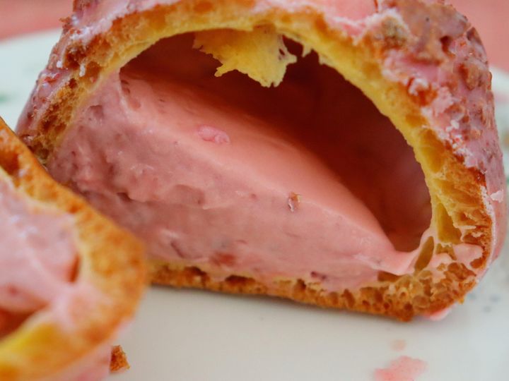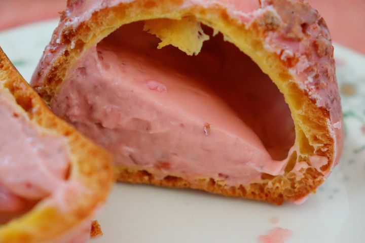 「クッキーシューだからサクサク」ということは想像できますが、いちごグレーズでコーティングされた場合のサクサク具合は果たしてどうなのだろうか?とドキドキしながら、まずは外側から一口。