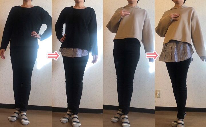 早速シンプルなコーデに合わせてみました。黒いセーターに黒いパンツという泥棒のようなスタイル(笑)が、付け裾を合わせるだけで「アリ」になった気がします!しかも、なぜか付け裾があった方がスッキリ見えるかも?