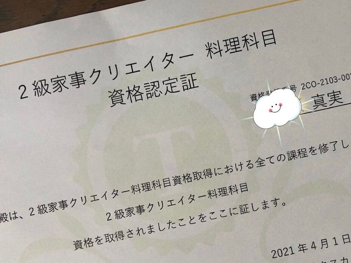 私が取得した資格は、「2級家事クリエイター(料理科目)」と「2級家事クリエイター(掃除科目)」です。先月に料理科目を取得し、今月掃除科目を取得しました。