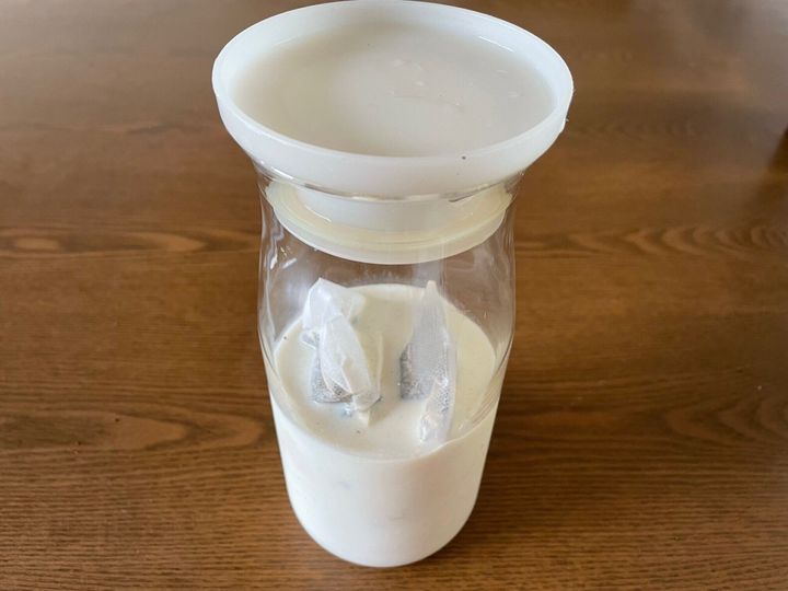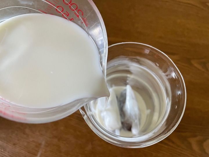 このとき、なるべく静かに少しずつ牛乳を注いでください。一気にジャーっと入れてしまうと、お茶パックの中のコーヒー豆が出てきてしまうので注意です。