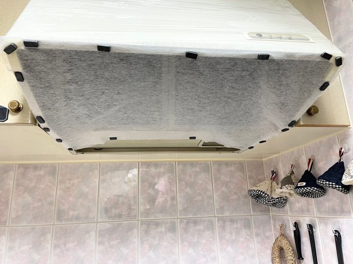 意外とほこりがたまるレンジフードの上部分には、ラップを貼って汚れをガード。なんだか汚れてきたな?と思ったときにラップを剥がしてポイ。剥がしたらまた新しいラップを貼っておけばOKです。