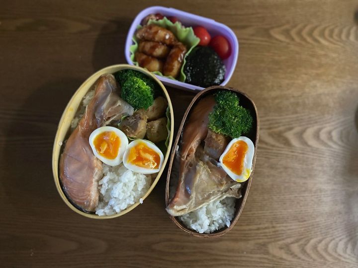 週のはじまり月曜日、夫と息子は焼き鮭弁当。里芋の煮物は夕飯用に多めにつくり、シリコンカップに入れて弁当用に冷凍しておいたものです。