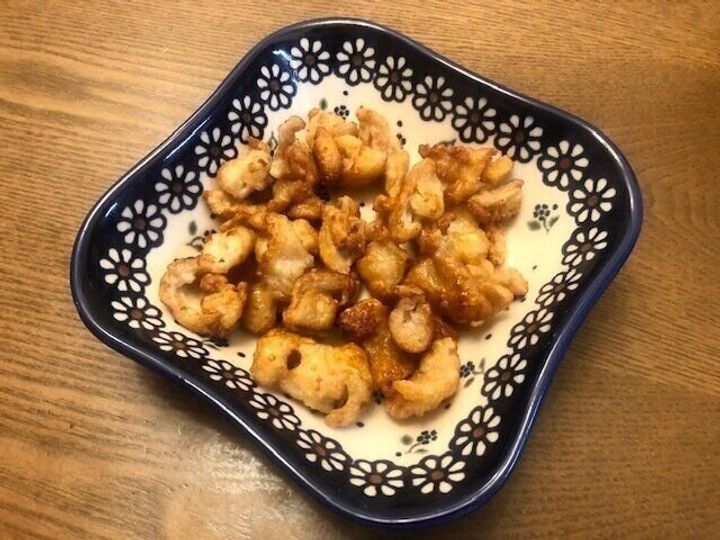 カリカリに焼いた鶏皮は、そのまま塩コショウをしておつまみとして食べてもおいしいですよ。ビールなどによく合います。