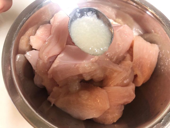 鶏むね肉をフォークでブスブスと刺し、繊維を壊した後に、塩こうじを揉みこみ、さらに水を吸わせると、やわらかくてジューシーな食感になりますよ。