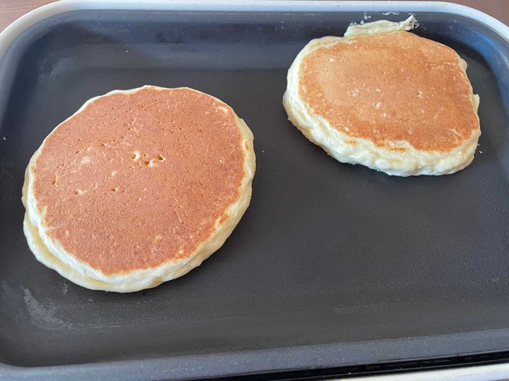 温めたホットプレートで、普通のパンケーキと同じように焼いていきます。表面がプツプツしてきたらひっくり返しましょう。