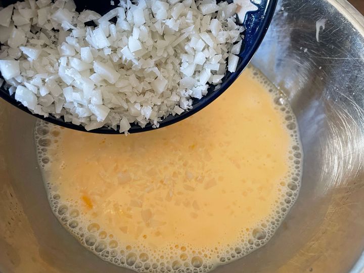 ボウルに卵を割り入れ牛乳と良く混ぜたら、刻んだもちを加えて混ぜます。