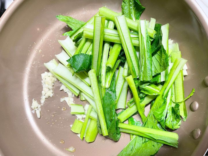 にんにくが少し香ってきたら、小松菜の下の方を入れて少し炒める。