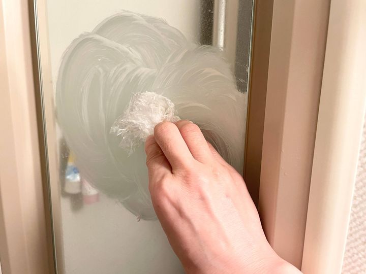たとえば、お風呂場の鏡や蛇口周りの水アカ取りに、丸めたラップにクレンザーをつけてこすり洗いに使用します。