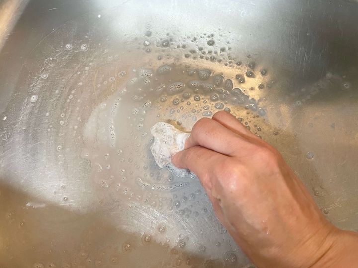 使い終わったラップをたわしとして使ってシンクを洗えば、シンク用のスポンジを用意する必要もなくなります。