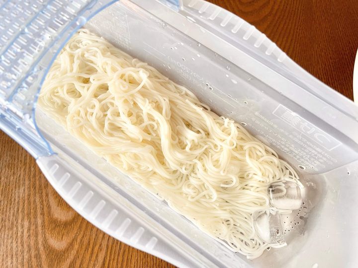 そうめんを入れたら、500wの電子レンジで茹で時間+2分加熱してお湯を捨て、流水でしっかり冷やして、もみ洗いをして完成。