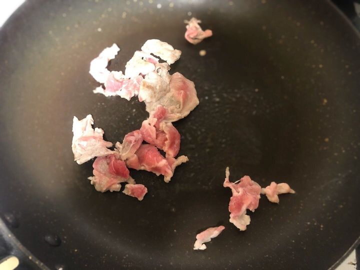 フライパンを強めの中火で温め、豚肉を炒めます。