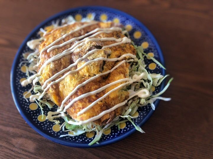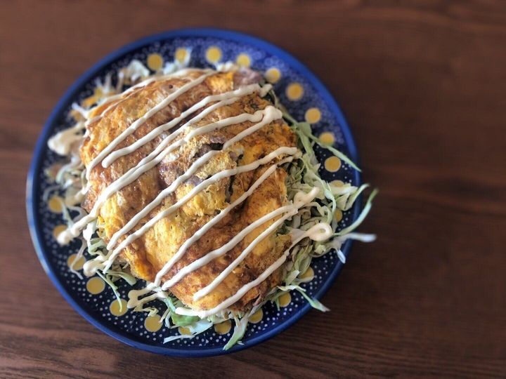 焼きあがったらキャベツの上にのせ、ソースとマヨネーズをかければ完成です!