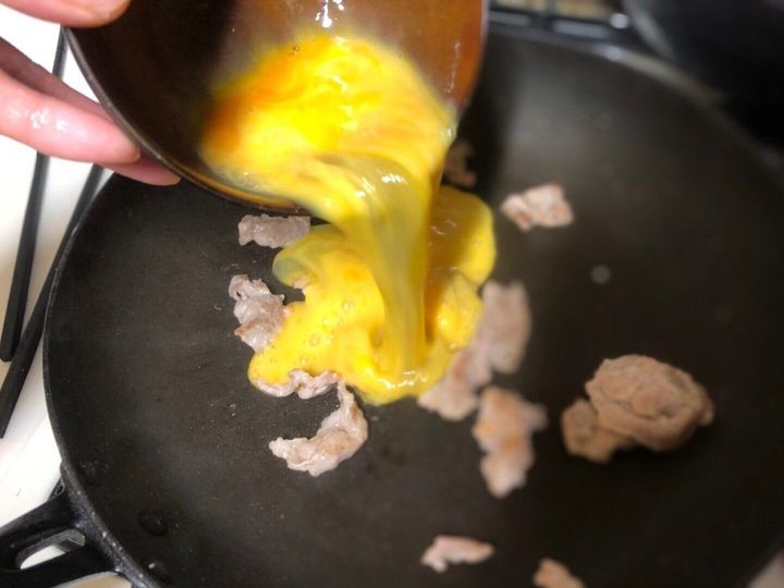 豚肉にだいたい火が通ったら、ときほぐした卵を入れ、ちょっとだけ全体をグルグルと混ぜます。