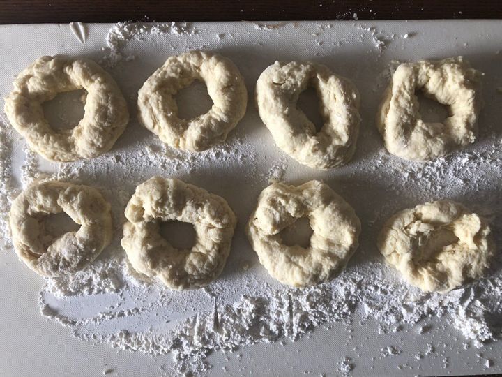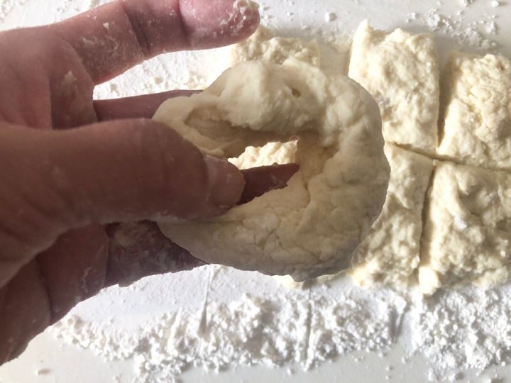 切り分けた生地を手で丸め、指で真ん中に穴を開け広げドーナツの形を作ります。