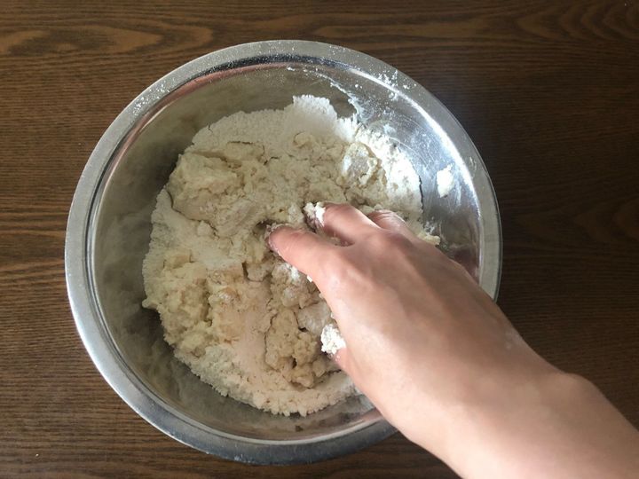 混ぜ始めは「あれ?もしかして水分足りないかな?」と思うかもしれませんが、きちんとまとまりますので水分を足したりしないようにしてください。(後でベタベタになってしまいます。)