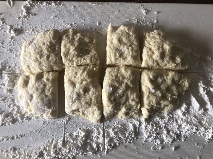 まな板などに打ち粉をふり、生地をのせ厚さ2cmくらいにのばし(手で適当にのばせばOK!)8等分くらいに切り分けます。