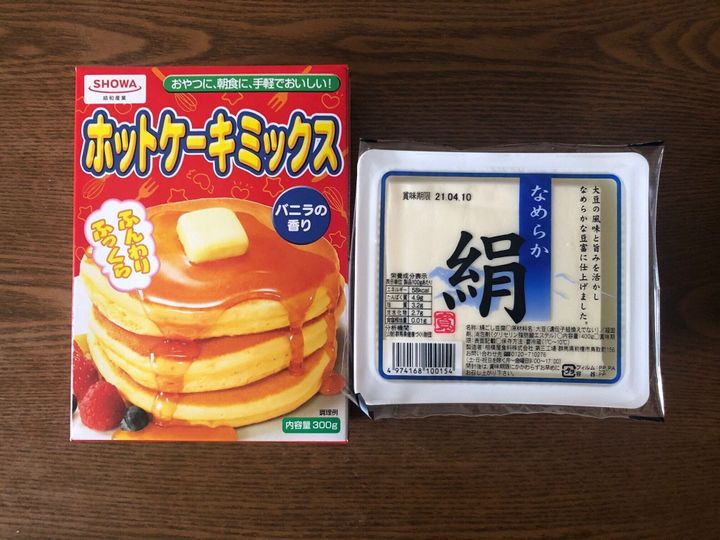 ボウルにホットケーキミックスと豆腐を入れ、まとまるまで混ぜ合わせます。(写真は手で混ぜていますが、最初はゴムベラなどで混ぜ、まとまってから手で混ぜた方が混ぜやすいです)