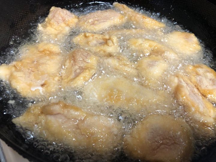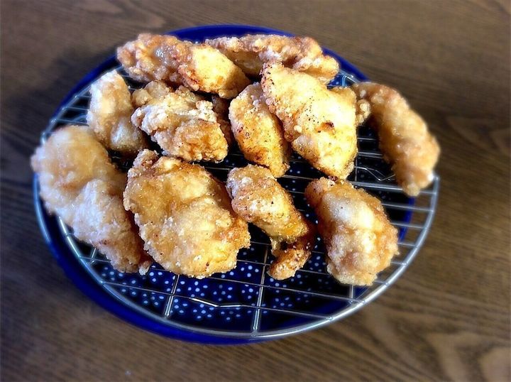 下味を付けたら片栗粉をまぶしつけ、170度くらいの油(菜箸を油に入れると細かい泡が立ってくるくらいの温度)で4分ほど揚げ、油から上げたら4分ほど置いて余熱で火を通します。揚げすぎも肉が硬くなる原因になりますので、揚げすぎないのがポイントです。