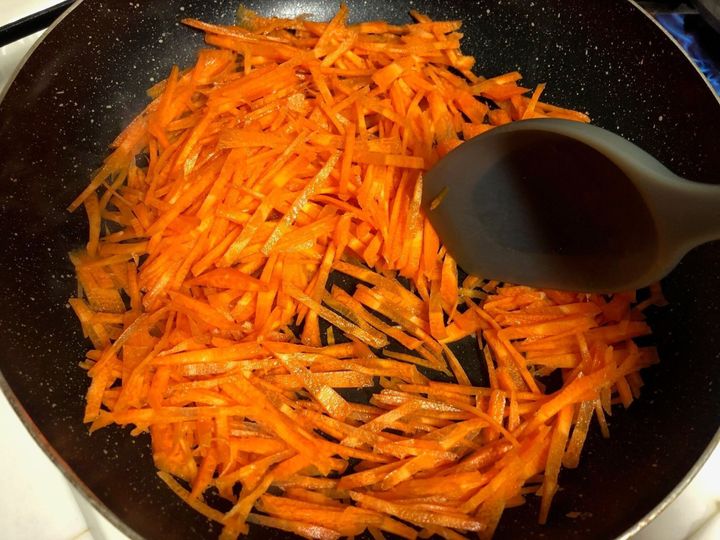 中火で温めたフライパンにごま油を入れ、にんじんを炒めます。