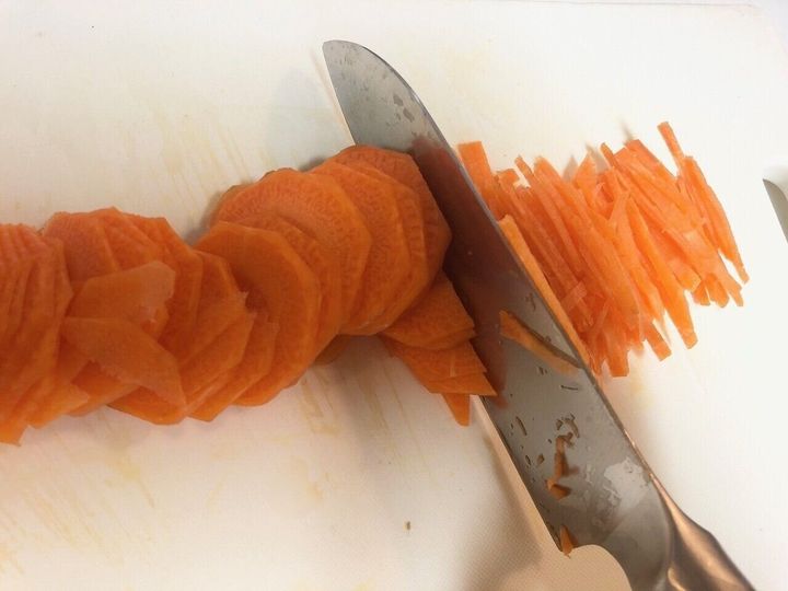 にんじんを細切りにします。スライスしたにんじんを、まな板に少しずつずらして並べ、端からダーッと細切りにしていくと早く一気に切れますよ。スライサーなどがあればそれを使ってもOKです。やりやすい方法で細切りにしてください。
