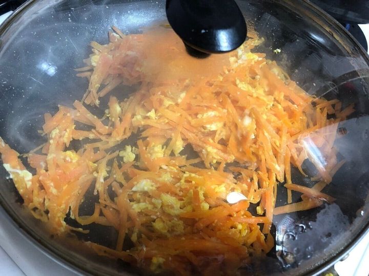 卵に火が通ったら、蓋をして火を消します。そのまま10分以上置いて余熱でにんじんに火を通したら出来上がりです。