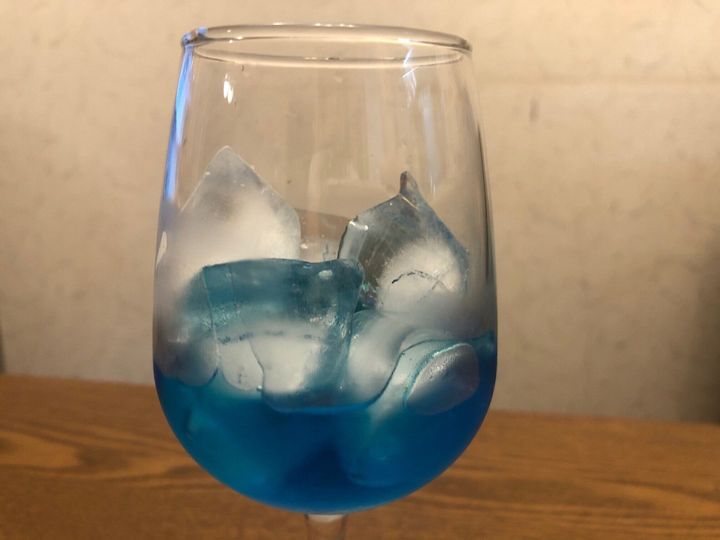 グラスに氷を適量入れ、かき氷シロップを大さじ2~3ほど注ぎます。濃さはお好みで調節してください。(写真では大さじ3のシロップを入れています)