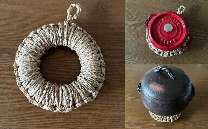 土鍋をのせたり、ストウブを載せたり、本当にヘビロテしています。私のテンションアップ鍋敷きです。(私が購入したのは2年ほど前なので、もしかしたら今はもう取り扱いはないかもしれません。い草の鍋敷きは、ネットなどでも購入が可能です。)