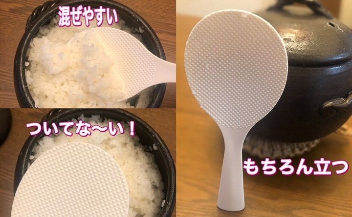 まずは、先端がとても薄くてご飯を潰さず、炊き立てご飯もサックリ混ぜやすい!ご飯が本当にくっつきません。もちろん立ちます。しかも立った時の安定感が抜群なんです。