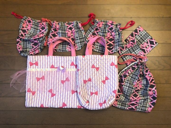 私としてはもう少しシックな柄の方がいいかなあ?と思いましたが、ここは全面的に娘の希望を採用。娘の幼稚園では、お弁当袋、コップ袋、ランチョンマットを2枚ずつ、着替え袋を1枚用意する決まりでした。