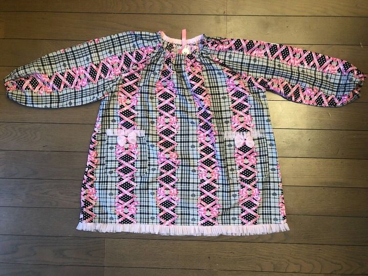 お弁当袋などと同じ生地で、スモックも作りました。園側から「工作などをする時に使うスモックも各自でご用意ください」とのことだったんですが、制服の短パンが隠れるくらいの長さという決まりがありました。既製品には丈の長いものがなかなかなく、せっかくなので自分で作ることにしました。スモックの型紙はネットでダウンロードできる無料のものを使用。裾やポケットにフリルを付け可愛く仕上げてみました。