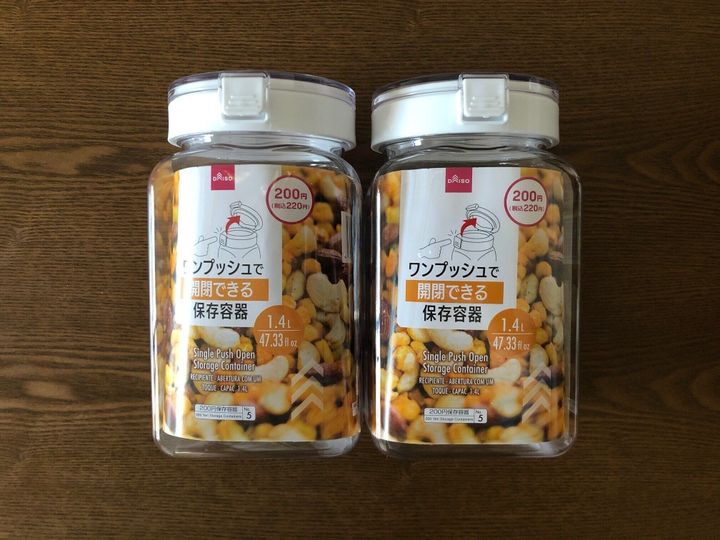 私のおすすめ保存容器は、ダイソーの「ワンプッシュで開閉できる保存容器」です。価格は、1.4Lサイズで220円。350mlや500mlサイズのものなら110円で購入できます。まずは色々使えそうな1.4Lサイズを選びました。