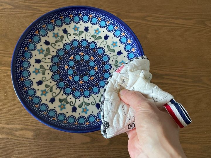 チンしたお皿を取り出すだけの為に、いちいち手にミトンを着けるのはちょっと面倒ですよね?三角鍋つかみならサッと取ってそのままお皿を掴めますよ。