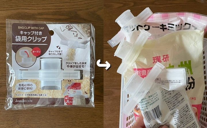 小麦粉などの粉物を開封した後、プラスチックのクリップなどで留めておく方は多いと思います。でも、使う時にいちいちクリップを付けたり外したりするのは面倒ですよね。料理の手も止まってしまいます。その点このクリップは、付けたまま中身が出せ、いちいちクリップを外したりの手間がありません。