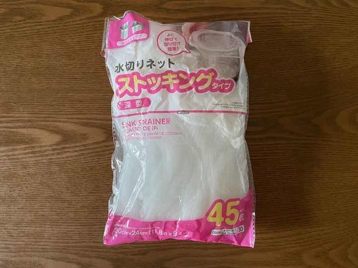 そして嬉しいのは45枚という大容量なところ。深型のストッキングタイプの水切りネットで、45枚も入っているのに110円というのは破格です!これだけ安いと遠慮なく頻繁に取り換えることができ、排水溝のキレイが保てます。消耗品なので定期的に買う商品です。