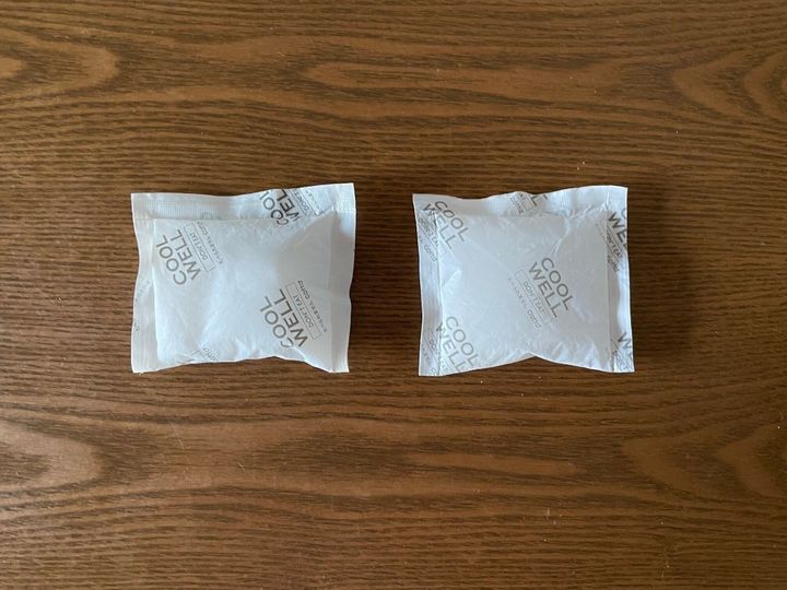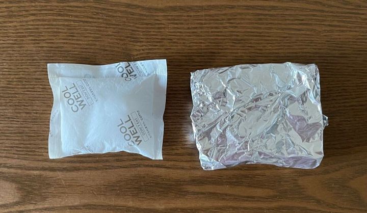 いったいどのくらいの違いがあるのでしょう?6cm×6.5cmの小さめな保冷剤を使って実験してみました。ケーキを買うと付いてくるくらいのサイズですね。一方はそのまま、一方はアルミホイルで巻いて、お弁当用の保冷バックに入れて部屋に放置してみます。
