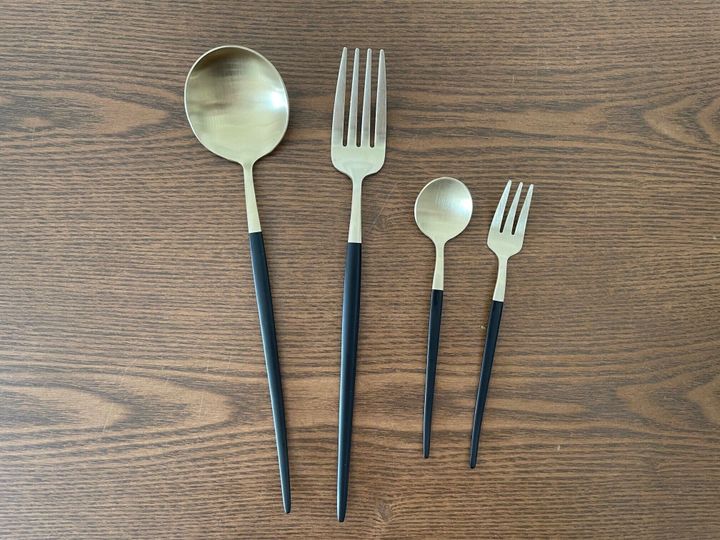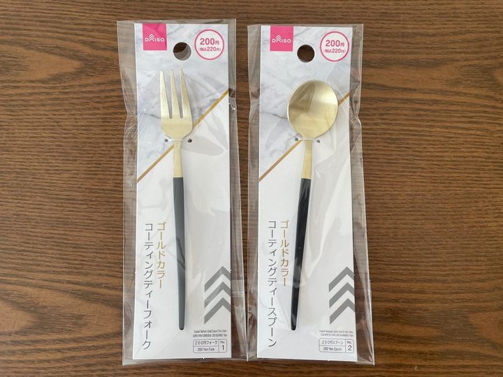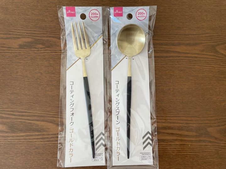 ご紹介するのは、ダイソーの「コーティングスプーン ゴールドカラー」と「コーティングフォーク ゴールドカラー」です。