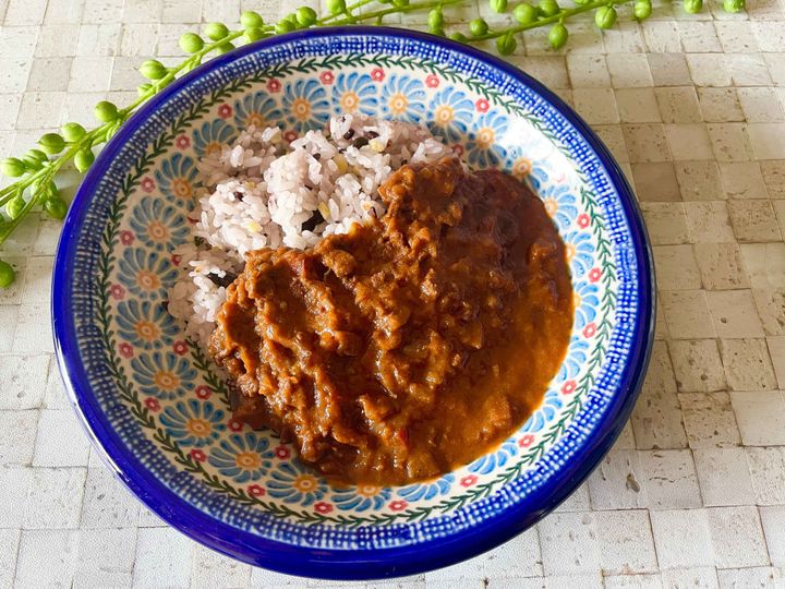 「大豆ミートのキーマカレー」は、これひとつで1日に必要な野菜の1/2が採れてしまう、うれしいカレー。しかも、大豆ミート使用で動物系原材料が不使用。とってもヘルシーなんです。