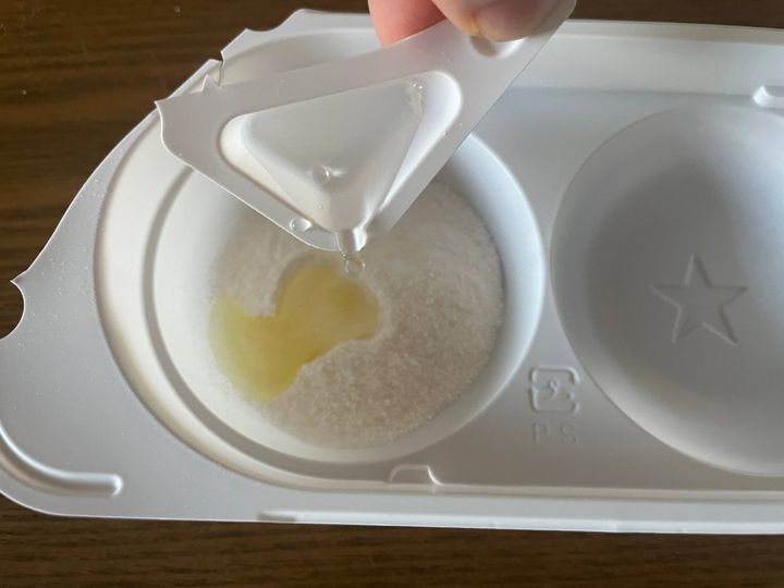 白ねるねるの1ばんの粉をトレイに入れ、トレイの角を切り取ったスプーンで水をはかって入れて混ぜます。