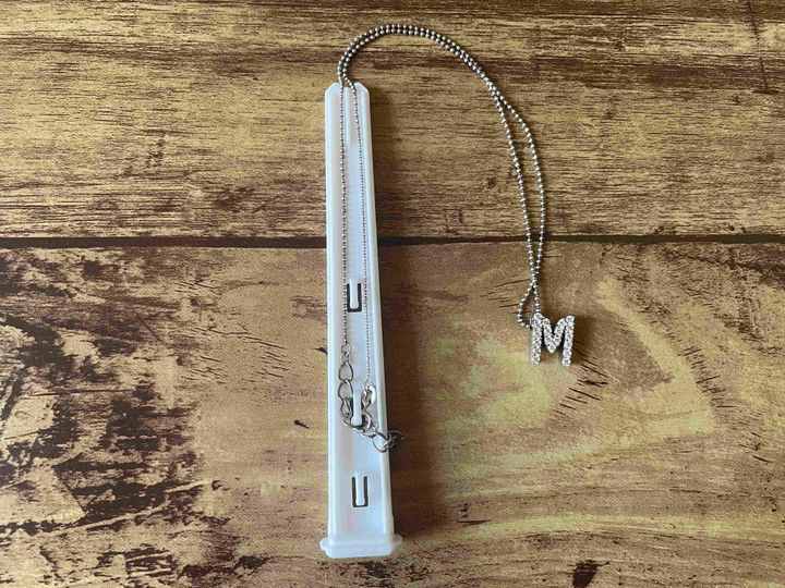 スリムな形だから、収納ケースにも入れやすい。同じスペースに2本のネックレスを入れても絡みません。