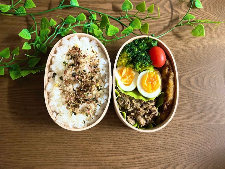 普通のおかずのお弁当ですが「曲げわっぱ」に入れるだけで、なんだかいい感じ~!