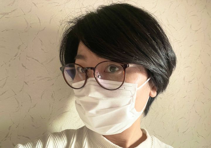 実際に着けてみると、マスクのサイド部分がフェイスラインにピッタリきます。一般的なプリーツマスクよりもスッキリ見えますね。