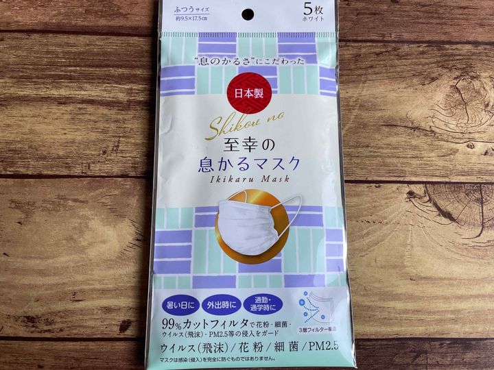 ご紹介するのは、ワッツの「至幸の息かるマスク」です。5枚入りで価格は110円。