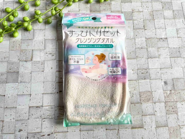 ご紹介するのは、ワッツの「すっぴんリセットクレンジングタオル」です。価格は110円。サイズは約21×17cmで子ども用のハンドタオル程度です。
