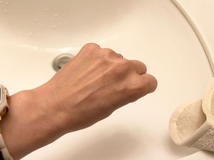 クレンジングタオルで手の甲をなでるように優しく洗います。