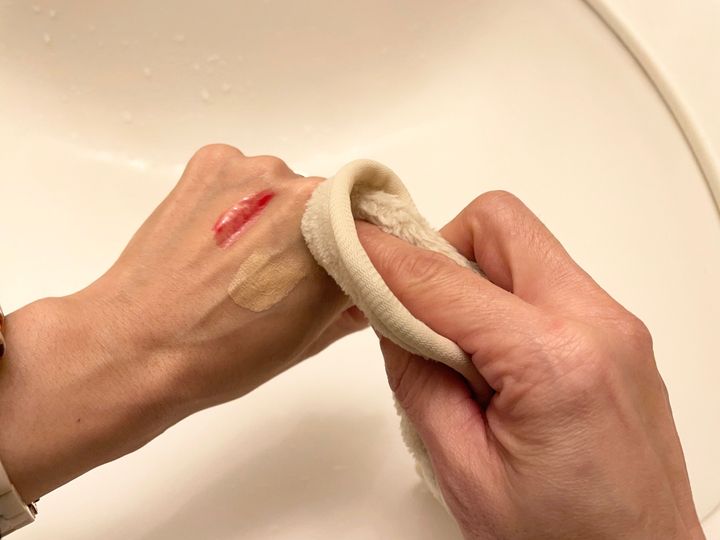 手の甲に、口紅とファンデーションをつけ、クレンジングタオルで落としてみました。