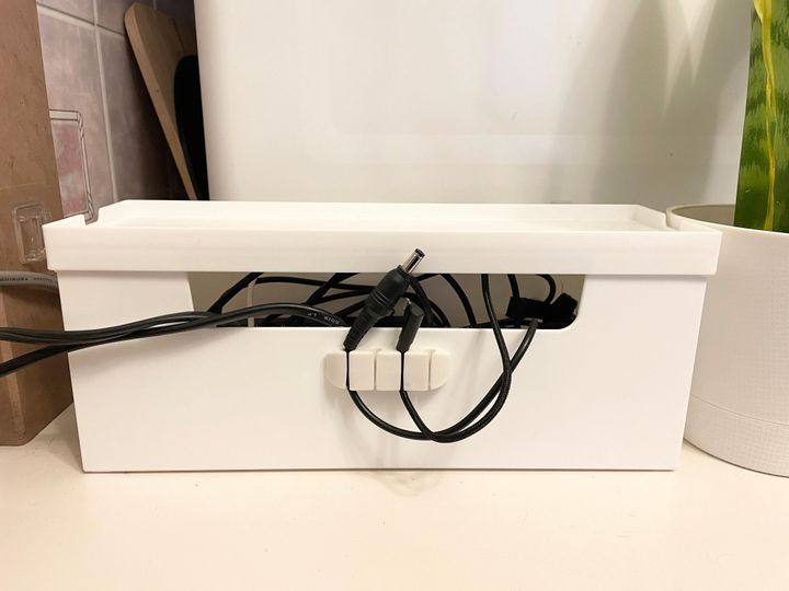 同じくダイソーのケーブルクリップを貼り付けて使うと、ケーブルが整理できてさらに便利。スマホやPCの電源ケーブルをここから出して使っています。