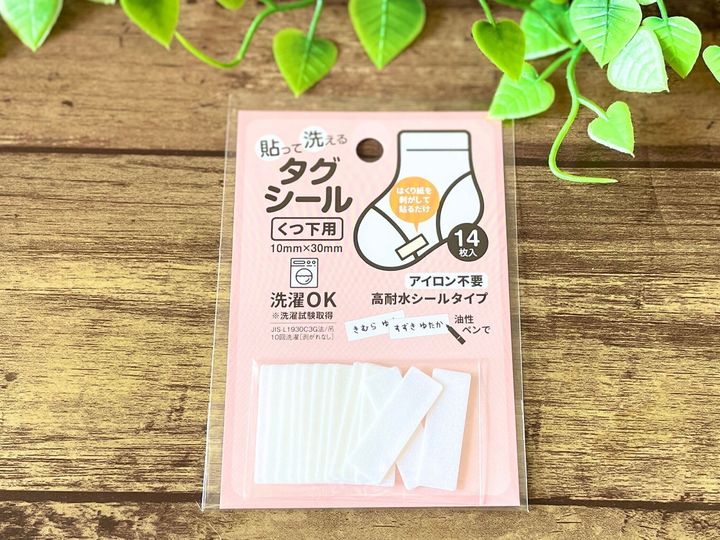ご紹介するのは、ワッツの「貼って洗えるタグシール くつ下用」です。約1cm×3cmの白いタグが14枚入りで価格は110円。