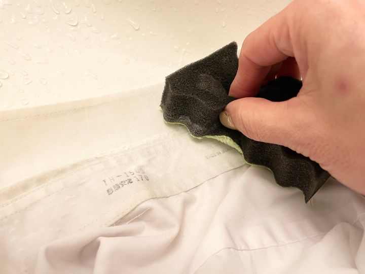 スポンジを水で濡らし、固形石鹸をつけて襟をこすっていきます。